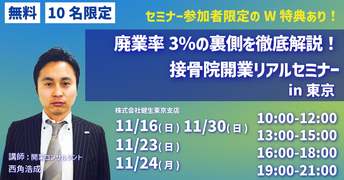 【11月東京対面/開業セミナー】廃業率3%の裏側を徹底解説!接骨院開業リアルセミナー